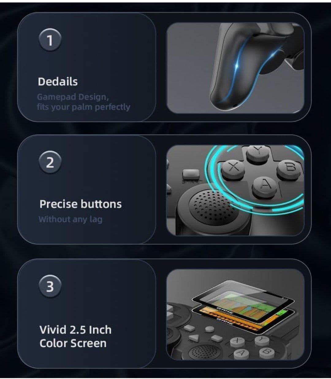 يحتوي على عدة أجهزة مثل ( PSP, PS1, SEGA , ATARI, GAME BOY) ويدعم تحميل ألعاب إضافية.